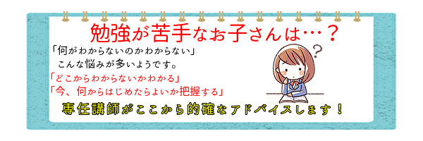 一方的に解き方や解説を聞いているだけでは、与えられることを待つ受身な習慣がつきやすい傾向があります。またその受身な習慣は応用問題や文章題、ちょっと悩んですぐにあきらめる習慣にもつながってしまいます。粘り強く考える習慣とベテラン講師と決めた「自分の力にちょうどよい問題」を自分で解くことができるようになることがお家で机に向かう習慣をつける手助けとなります。